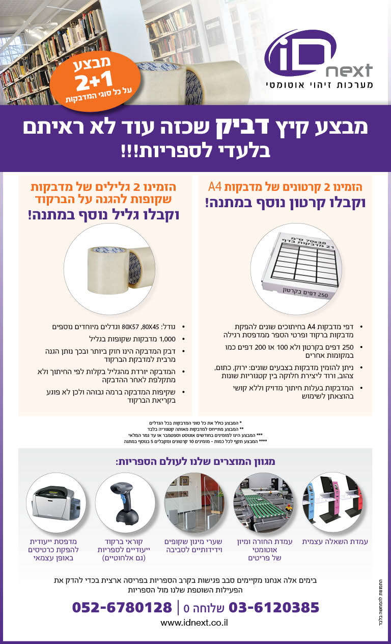 - דפי מבקות A4 בחיתוכים שונים להפקת מדבקות ברקוד ופרטי הספר ממדפסת רגילה